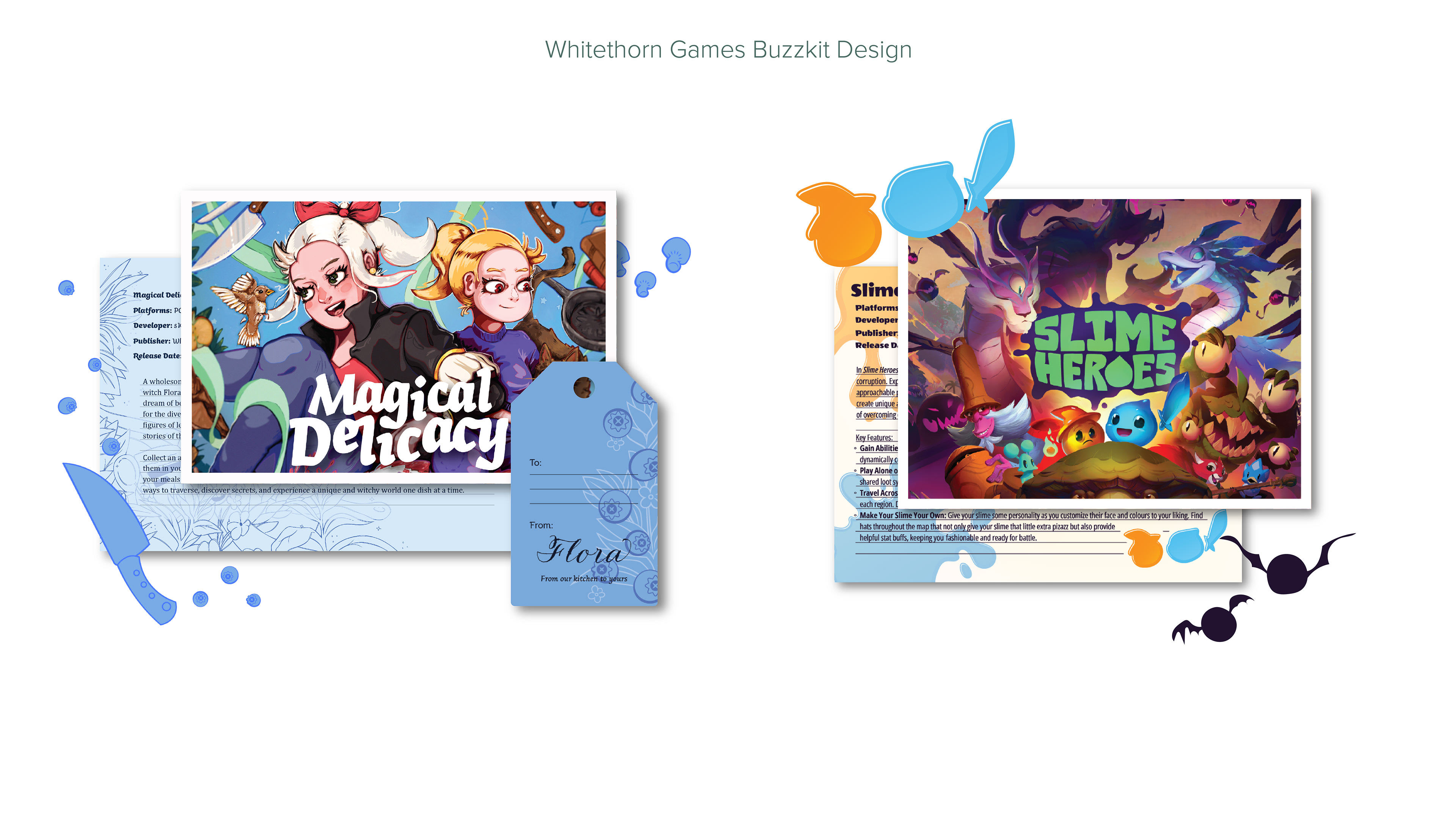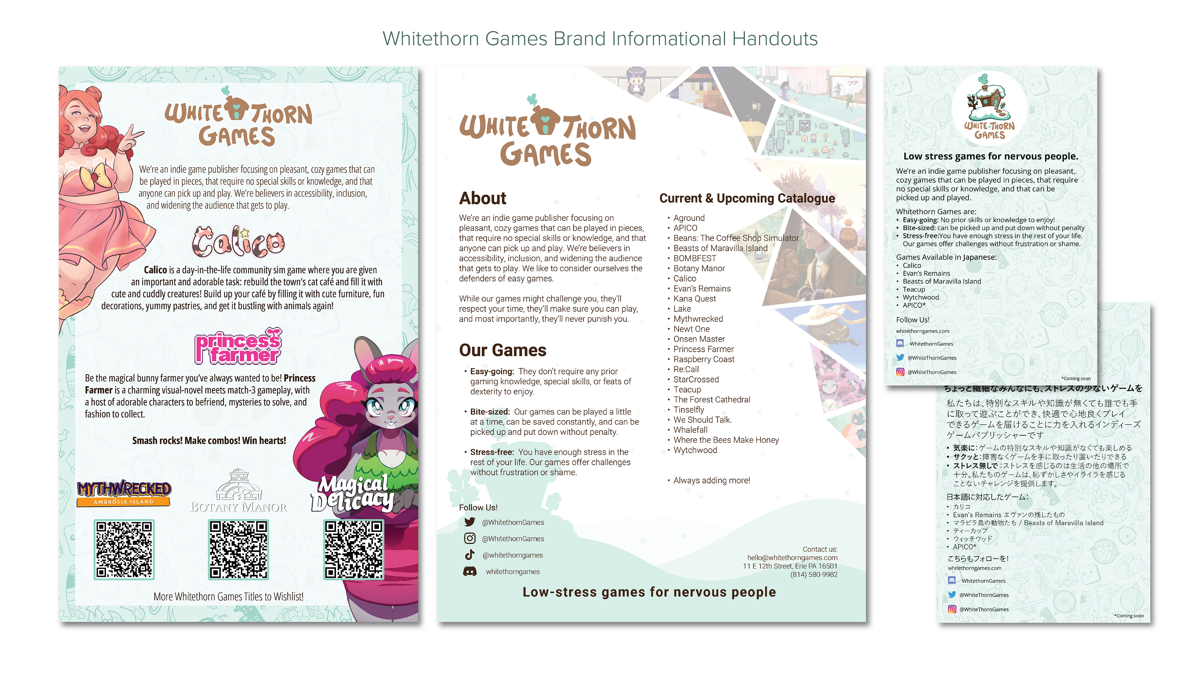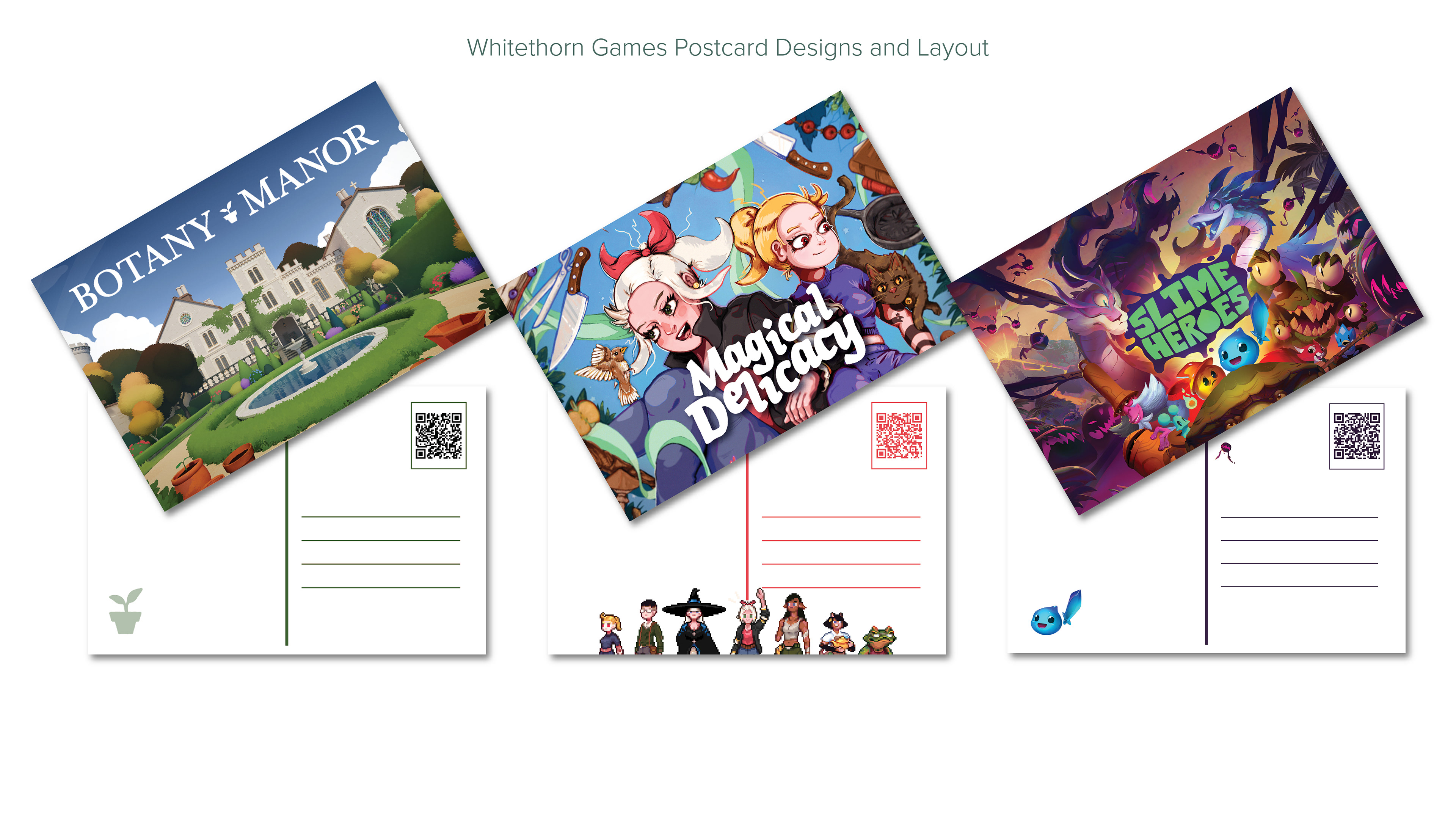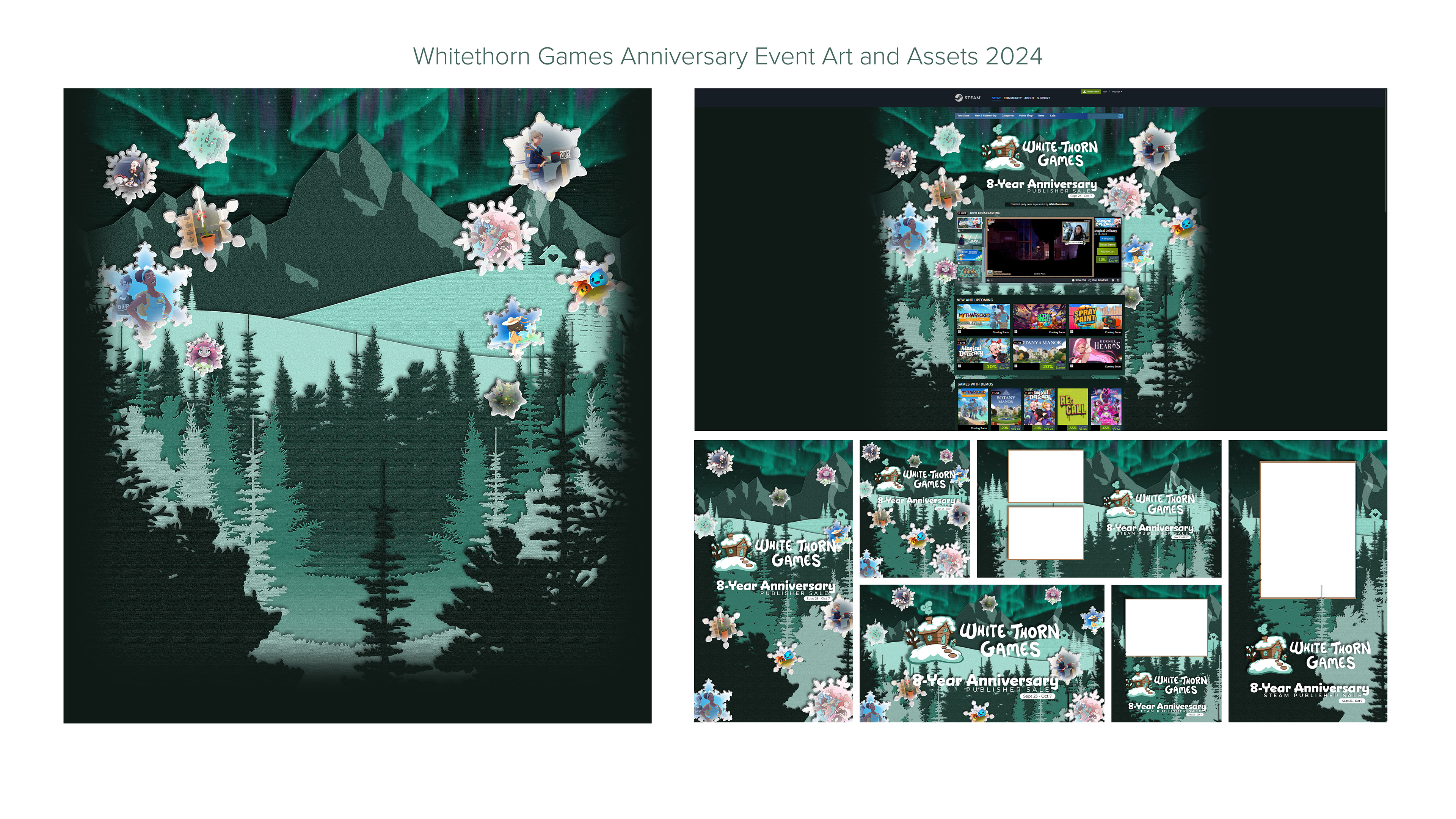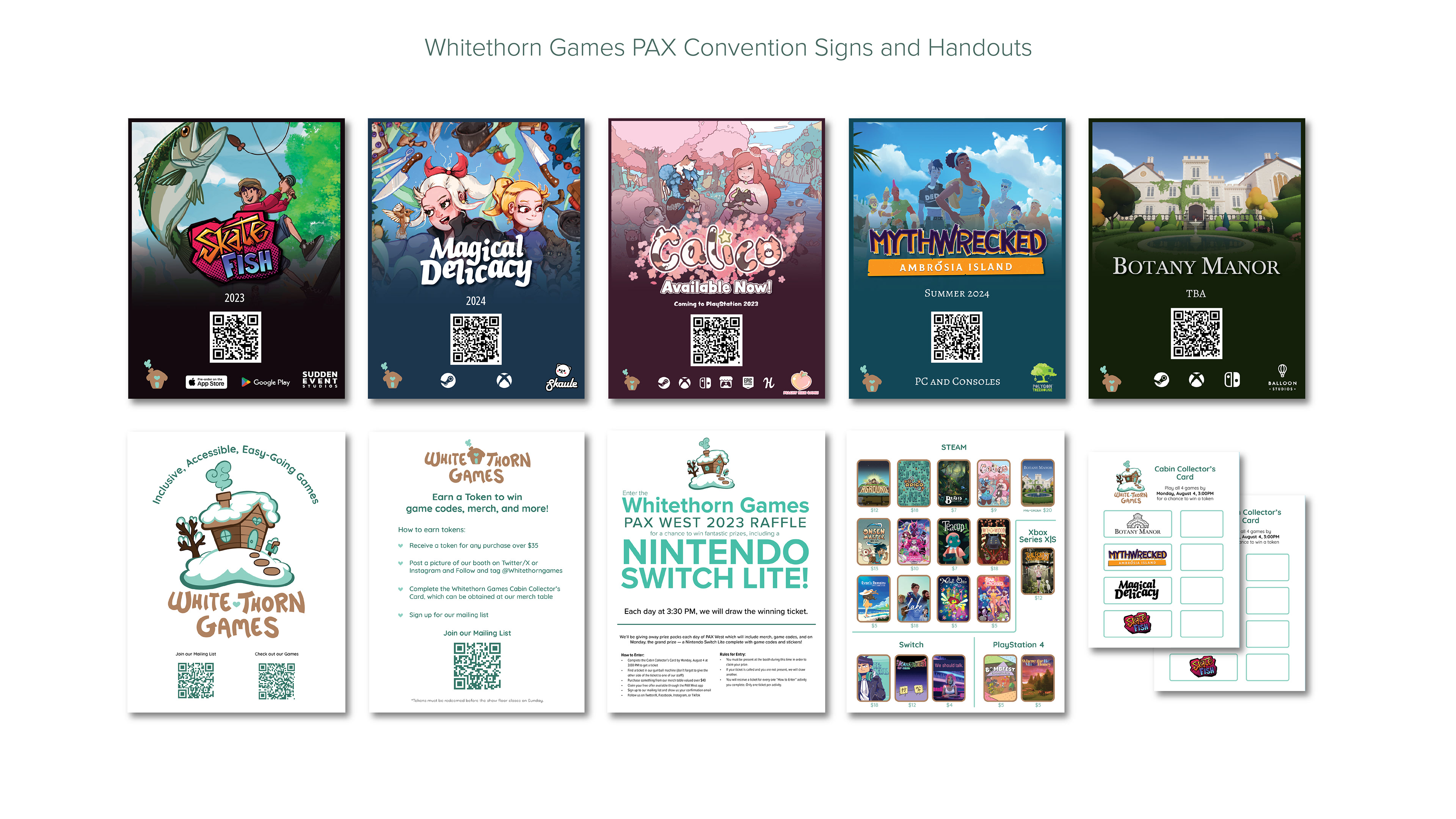 At Whitethorn Games, I bring a multidisciplinary approach to design, ensuring brand consistency while adapting creative solutions across diverse platforms. My work spans digital, print, and video design, reflecting the versatility needed to support a growing game studio. Digitally, I craft event assets, catalogue visuals, and event imagery that strengthen Whitethorn’s online presence. In print, I design handouts, event signage, apparel, pins, and postcards that translate the brand into tangible experiences. I also contribute to trailers and video projects, blending storytelling with motion graphics to engage audiences in dynamic ways. This breadth of work demonstrates my ability to shift seamlessly between mediums, tailoring each project to its context while maintaining a cohesive brand identity.